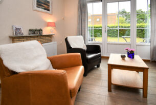 In de woonkamer staat een zitje voor de schuifpui en er is een comfortabele leren zithoek.