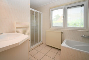 De badkamer is voorzien van een ligbad, douche en wastafel, het toilet is apart.